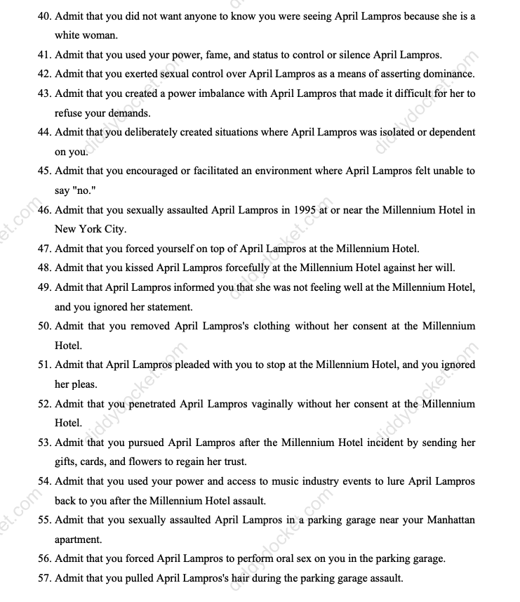 Plaintiff April Lampros serves 155 targeted admissions asking Defendant Sean Combs to concede everything from alleged rapes and secret sex tapes to STD testing and a pattern of abuse mirroring his federal Mann Act case.